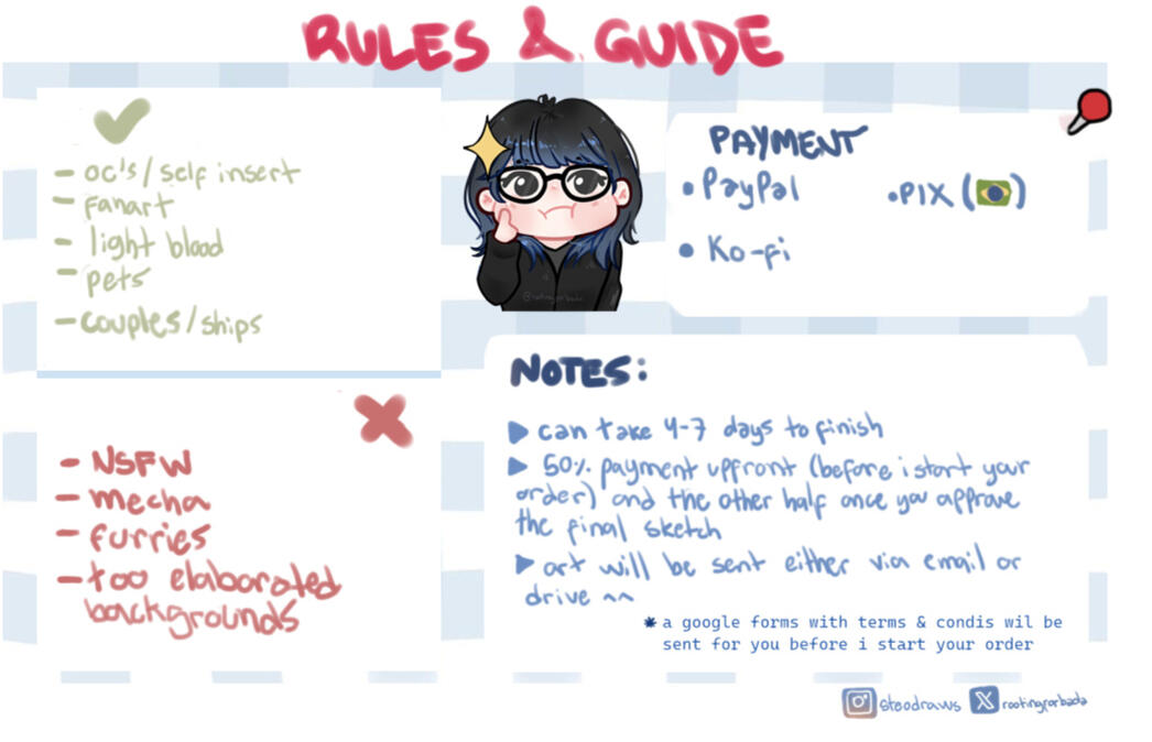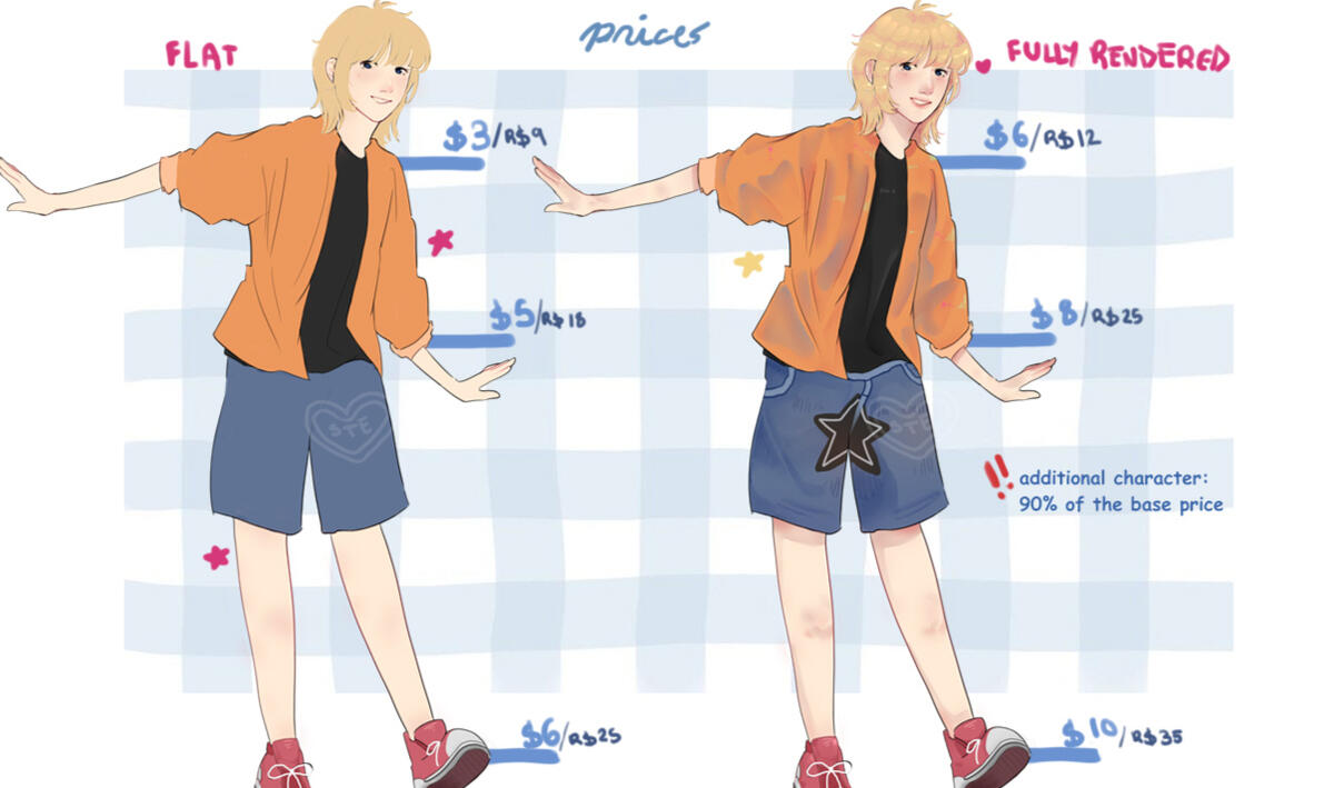 ✧ Won't draw: NSFW; Mecha or armor; furries; too elaborated backgrounds.Payment Methods: PayPal, Ko-fi, PixKeep in mind that your order can take 4 to 7 days to be fully finished, i will send you a google forms once you show interest in commissioning me with more terms :))