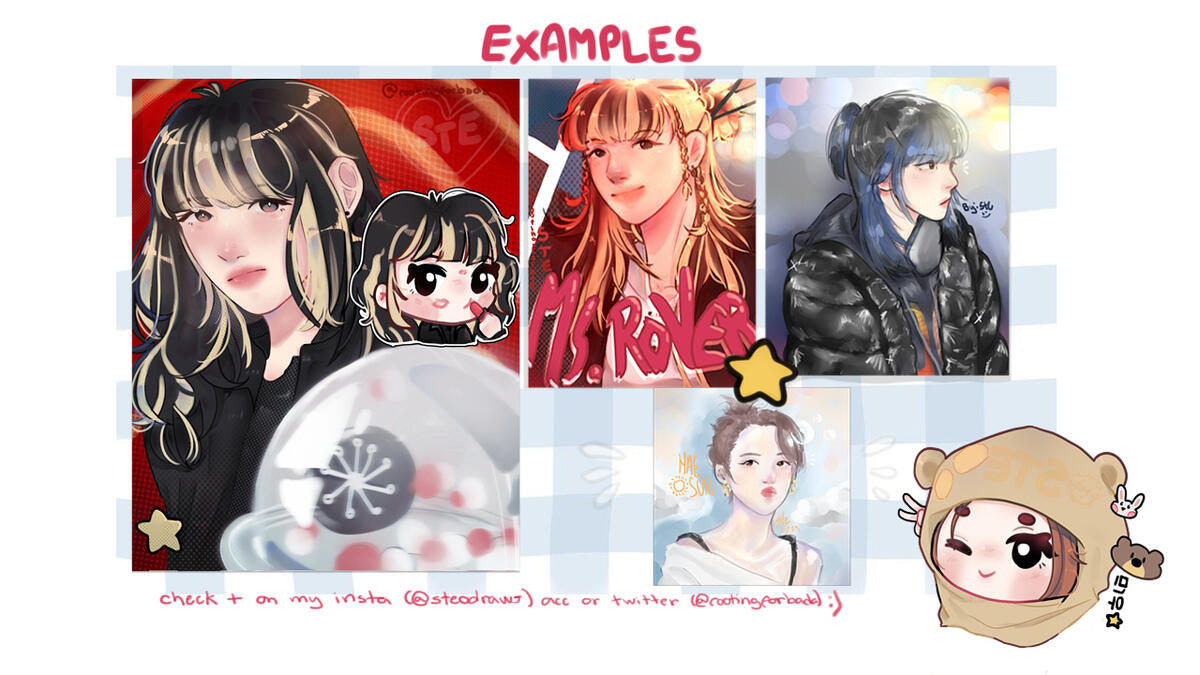 Some exemples of my artworks so far, be my guest to visit my socials and check some more exemples, also feel free to ask me whenever style you want me to do!! let's work happily 🐋